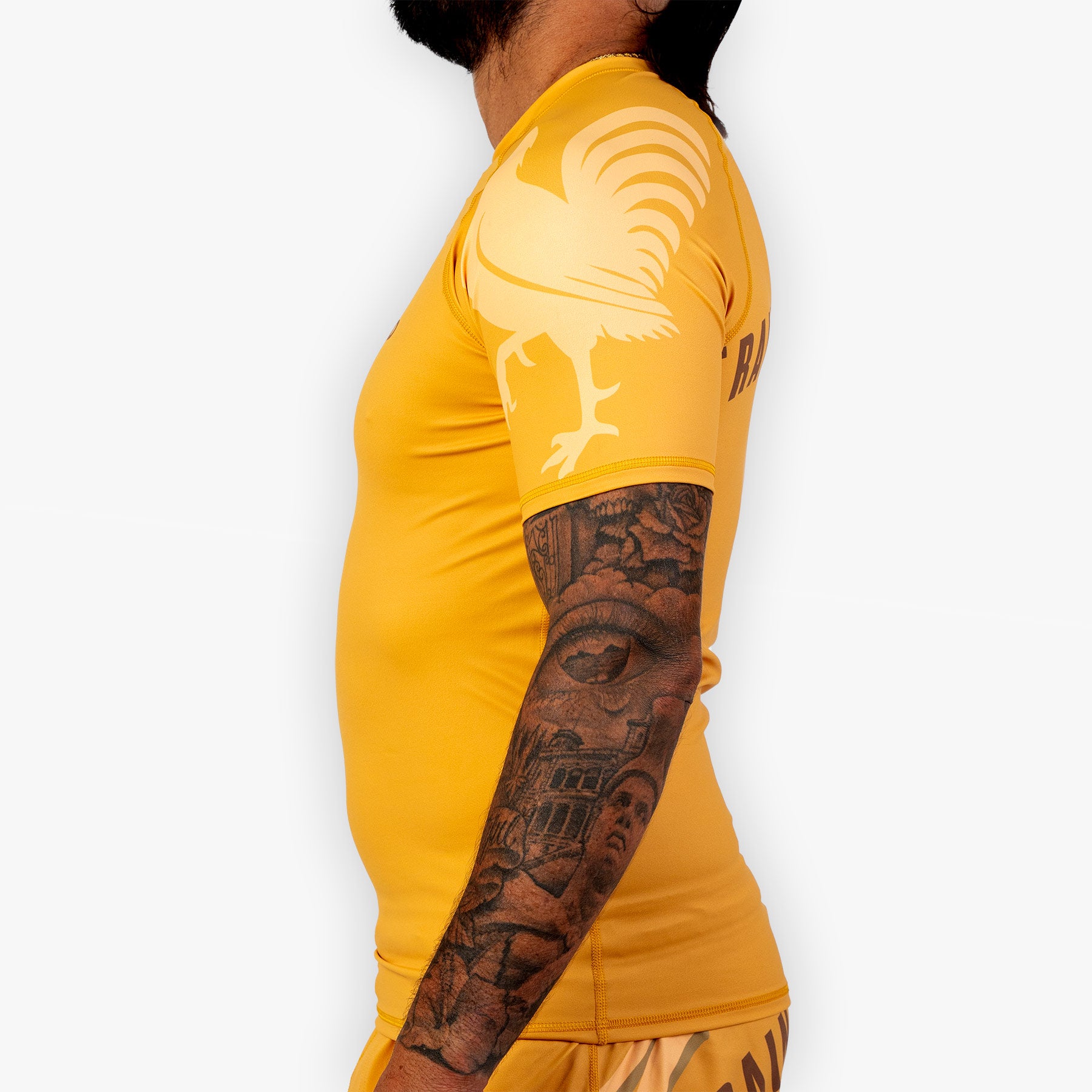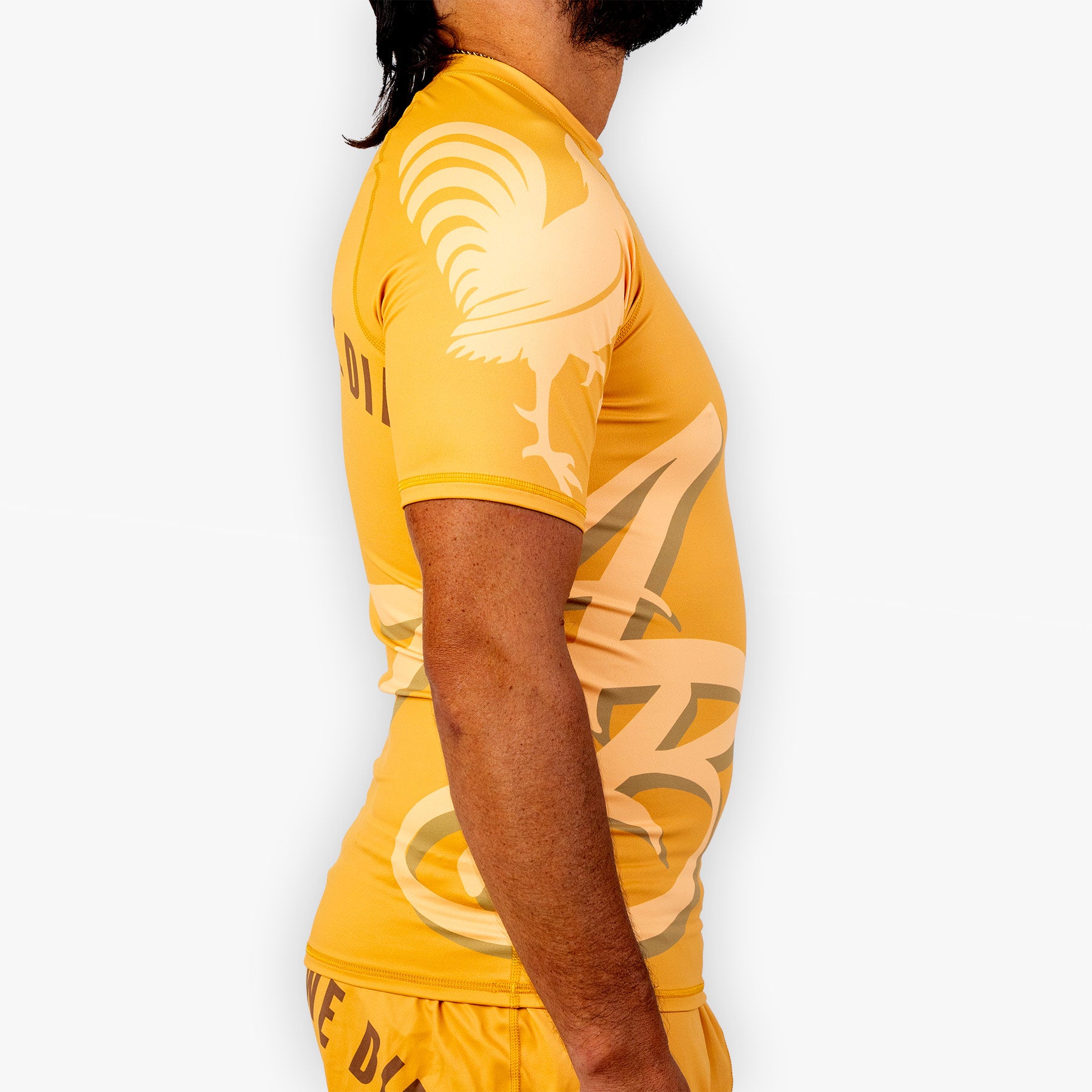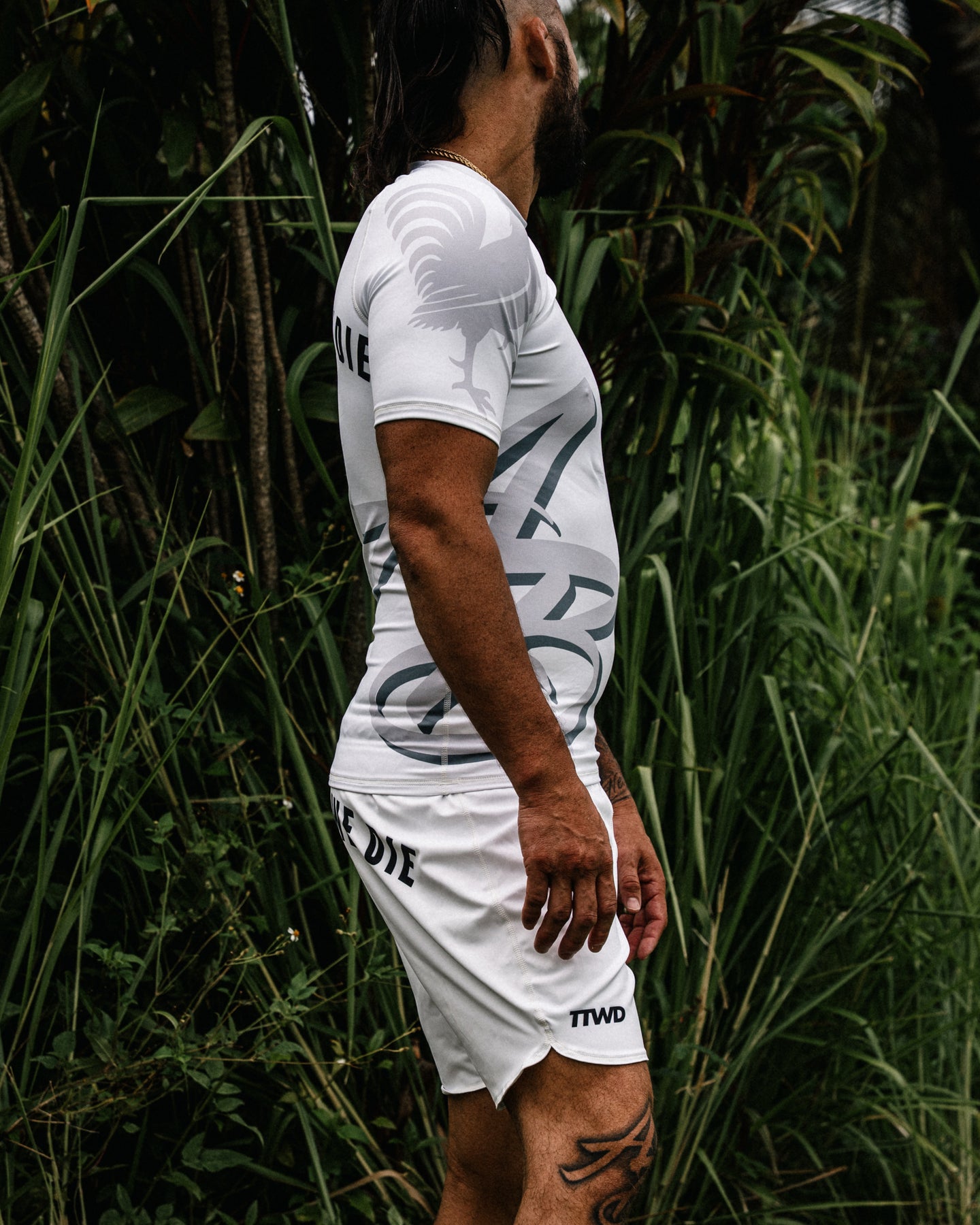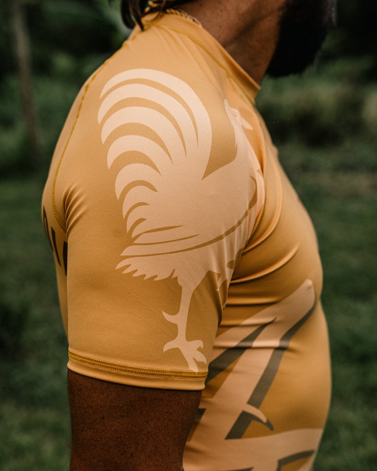 Each rash guard was entirely made in Los Angeles, California. This high-grade, fully sublimated rashguard is made from a durable, moisture-wicking, 4-Way-stretch material. (84% Polyester / 16% Spandex).