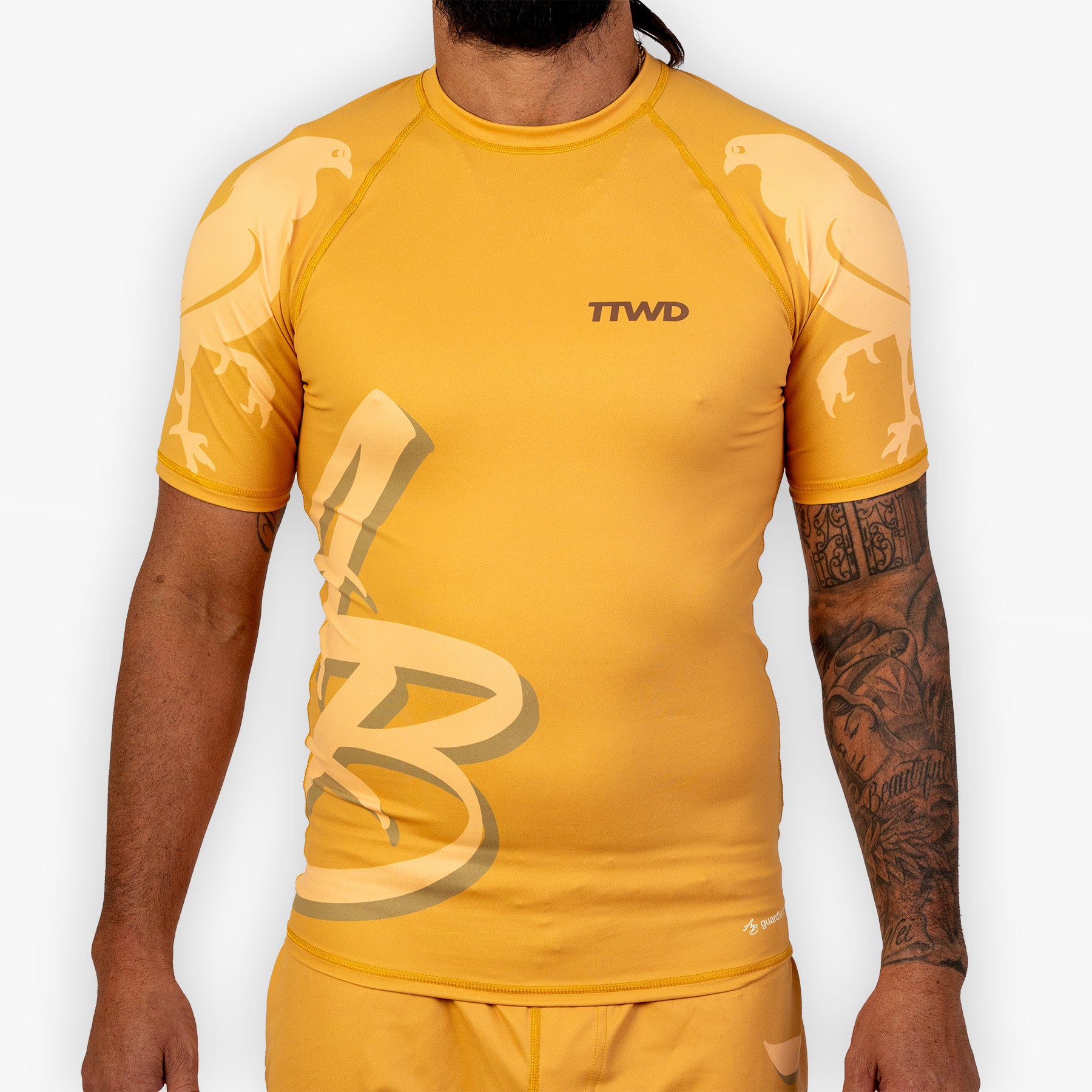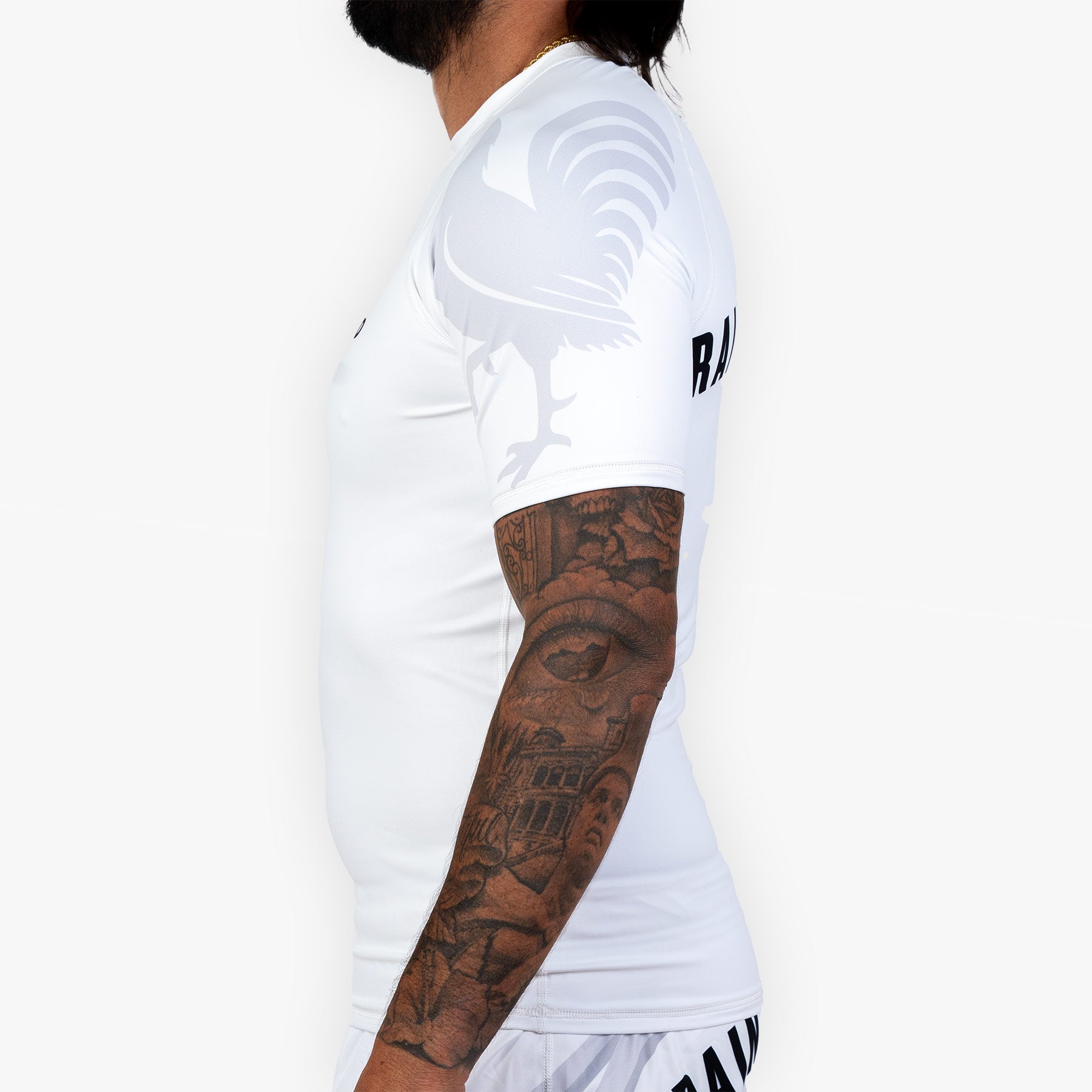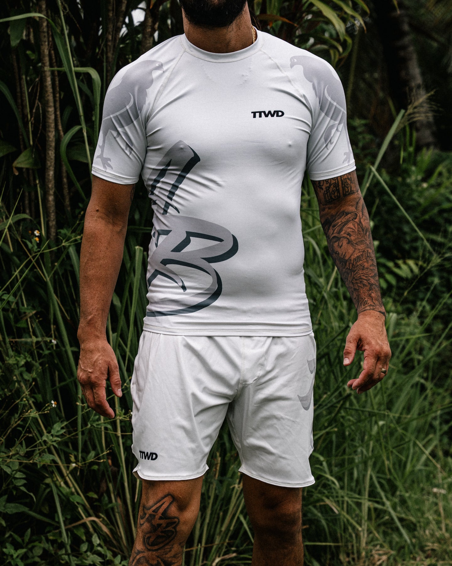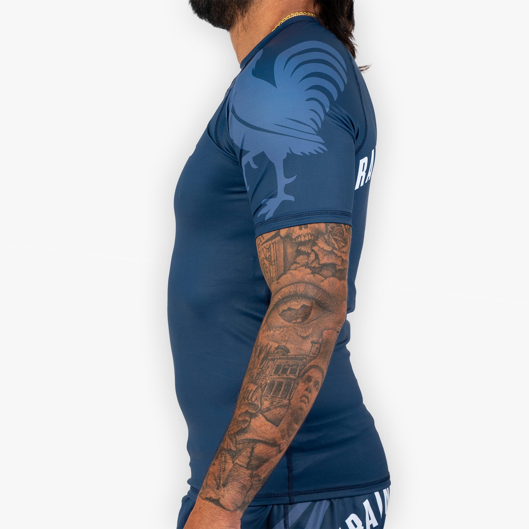 Each rash guard was entirely made in Los Angeles, California. This high-grade, fully sublimated rashguard is made from a durable, moisture-wicking, 4-Way-stretch material. (84% Polyester / 16% Spandex).